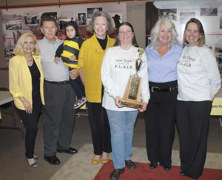 Pictured above left to right are Kathryn Bornhauser (FLAIR Coordinator), Don Johnson (Santa Paula Times), Spelling Bee Karin, Pronouncer Leslie Nichols, winning team members Suzi Skutley, Peggy Kelly, and Marianne Ratcliff (photo by Debbie Johnson). |